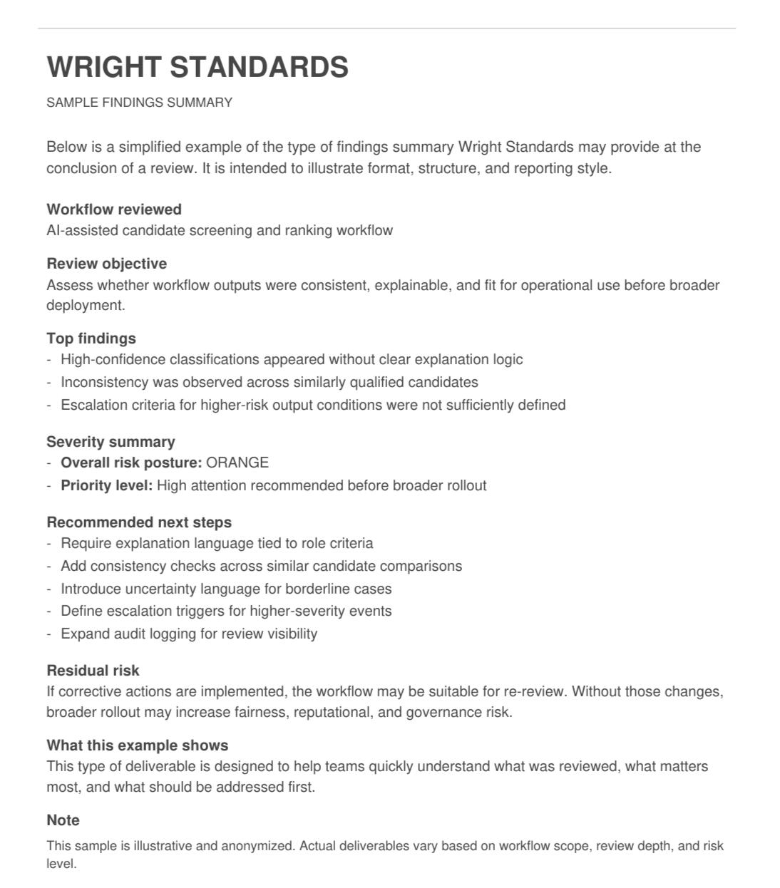 Wright Standards reviewed a defined hiring workflow, analyzed anonymized outputs, tested paired candidate comparisons, and ranked findings by severity based on business consequence.